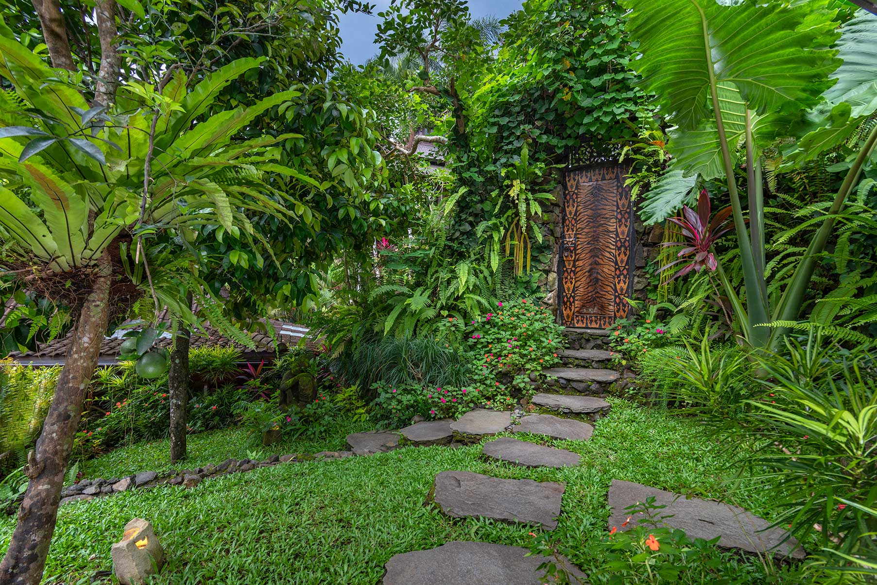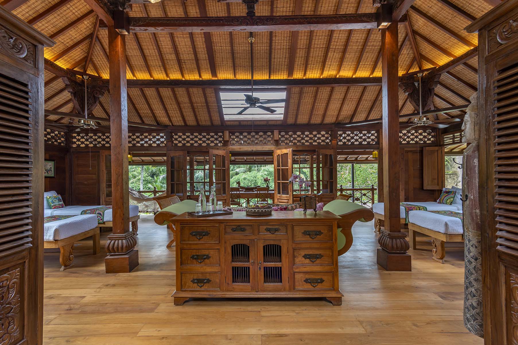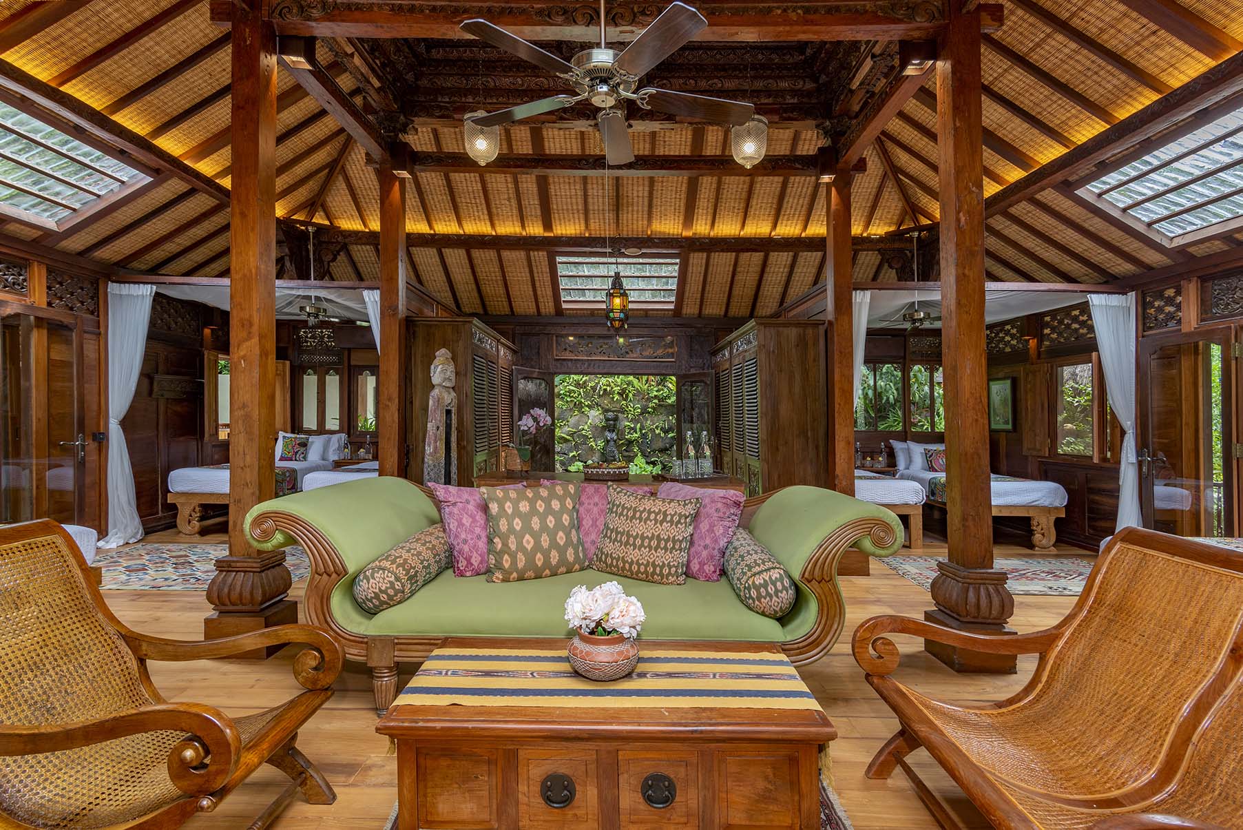Surrounded by carved timber and warm woven ceilings, Butterfly is expansive, grounded, and quietly majestic. Soaring beams rise above a generous open-plan space that flows effortlessly toward lush garden views. Handcrafted details frame wide doors and windows, inviting light and air to move freely throughout. The house can be configured with multiple beds, making it ideal for groups, families, or retreat gatherings.