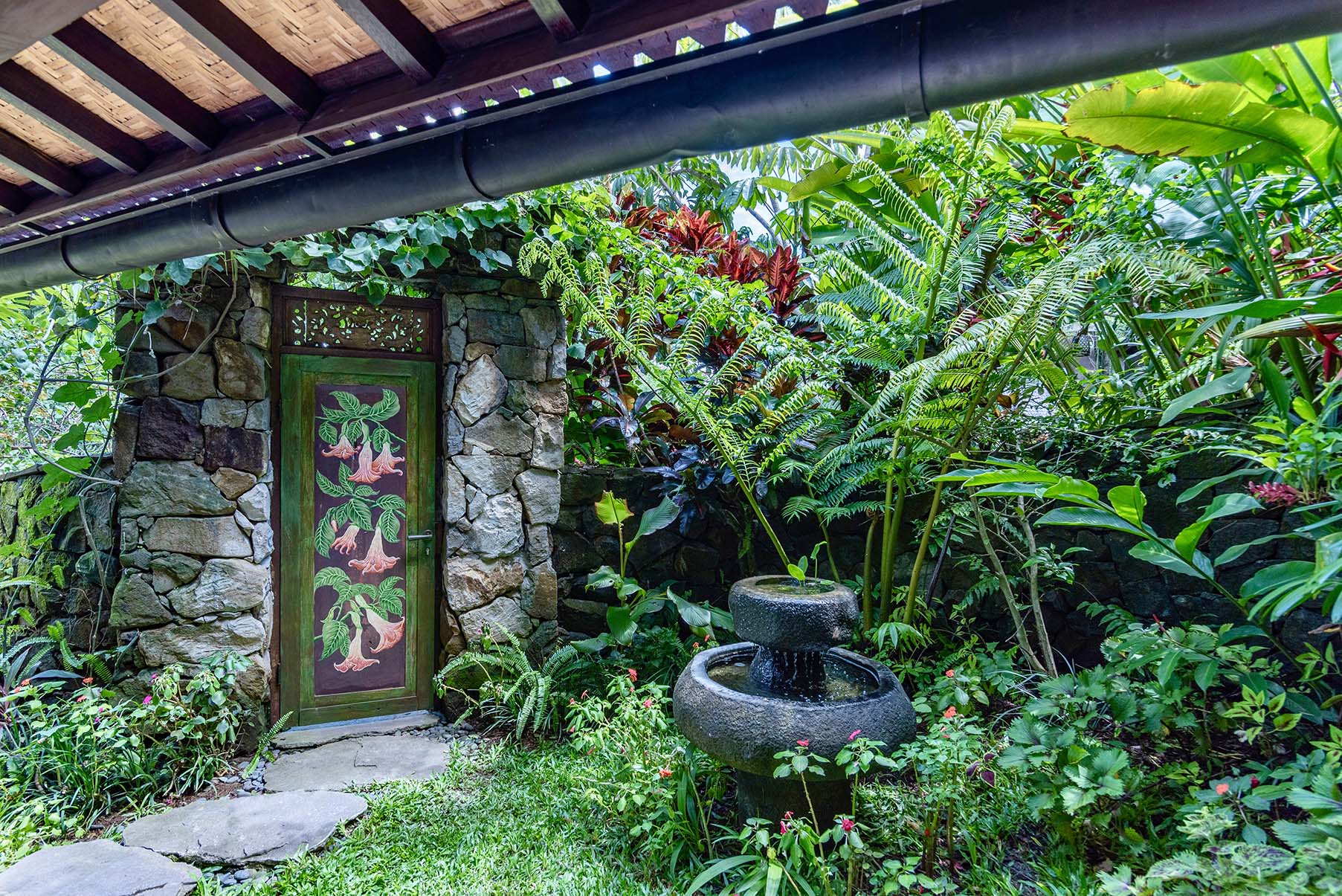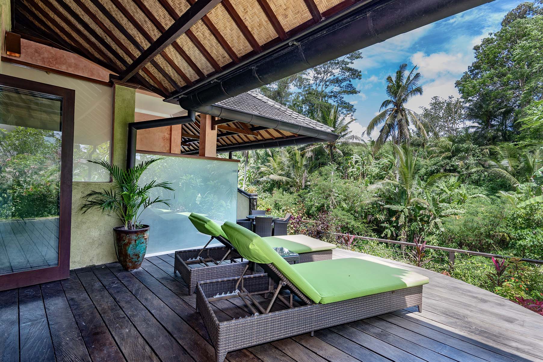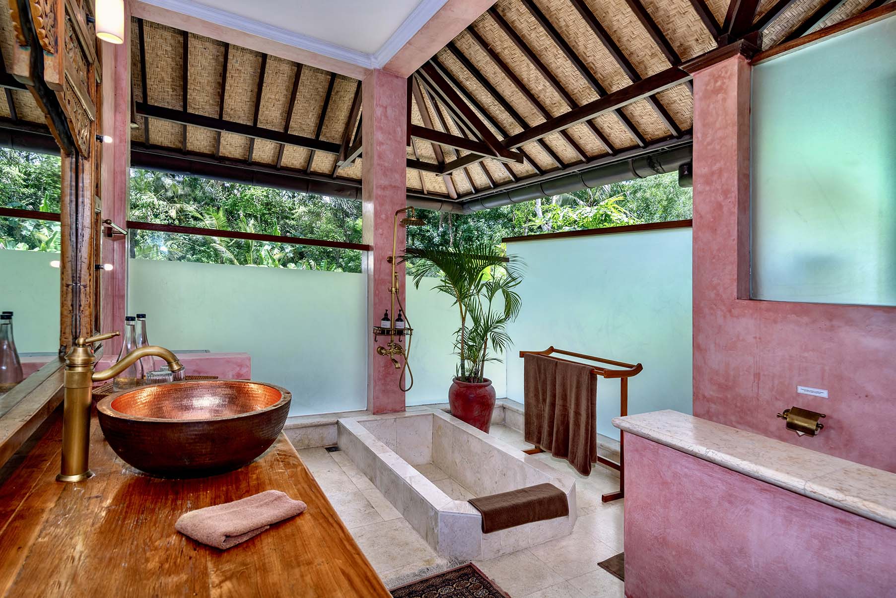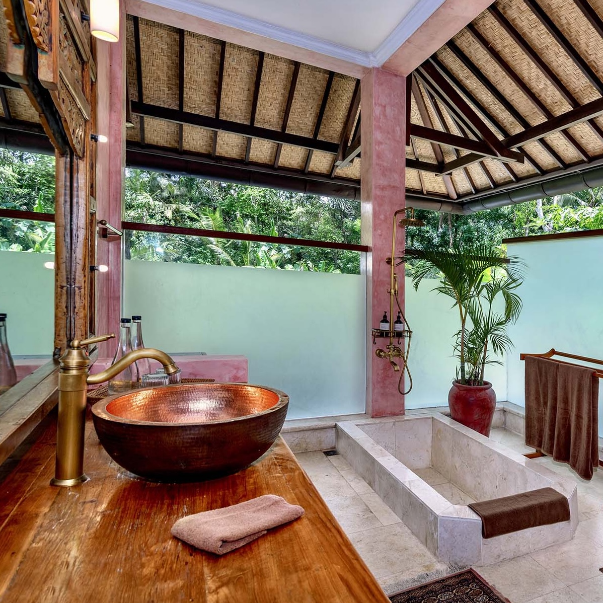 Datura sits within Lumina’s main house, overlooking the lush river valley. Soft pink walls and warm wood details create a calm, spacious retreat that opens easily to the surrounding greenery. Large glass doors lead to a generous private terrace with lounge chairs and wide views across the yoga deck and river below. The space invites slow mornings, afternoon reading, and quiet evenings above the valley. An open air bathroom sits beneath a woven bamboo roof, with a deep stone tub, copper basin, and views of the surrounding treetops. Datura shares the main house with Poppy and can connect with the neighbouring room, making it an ideal space for friends or family traveling together.