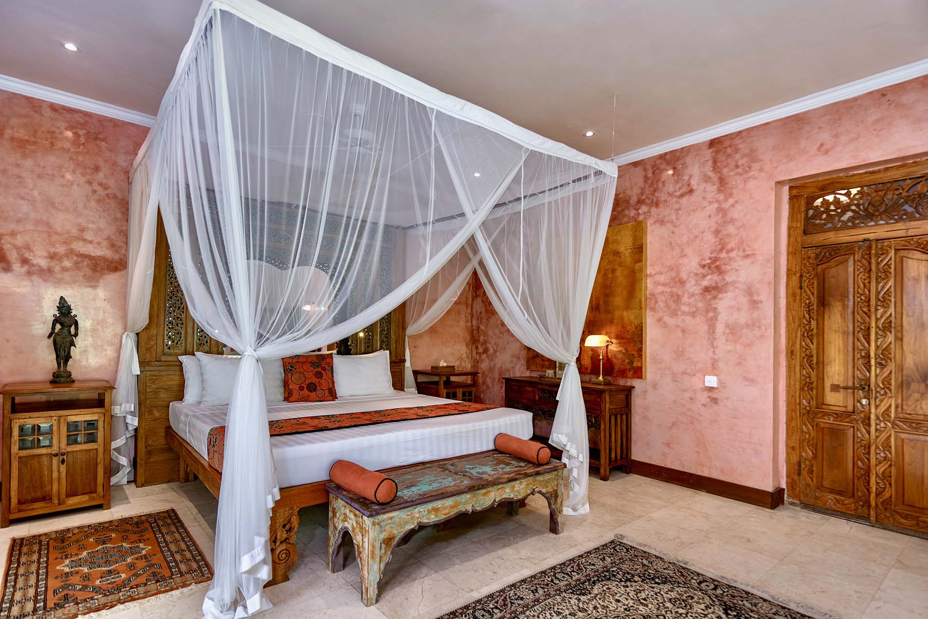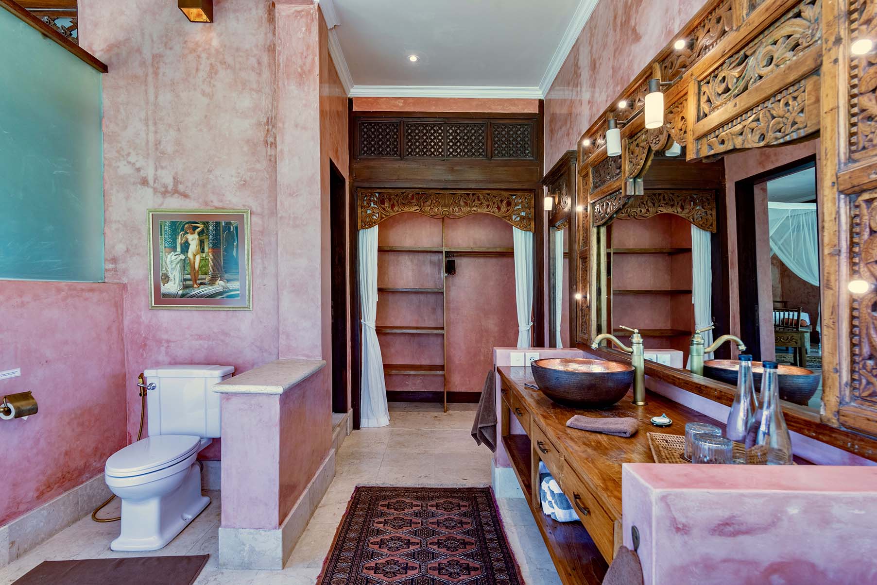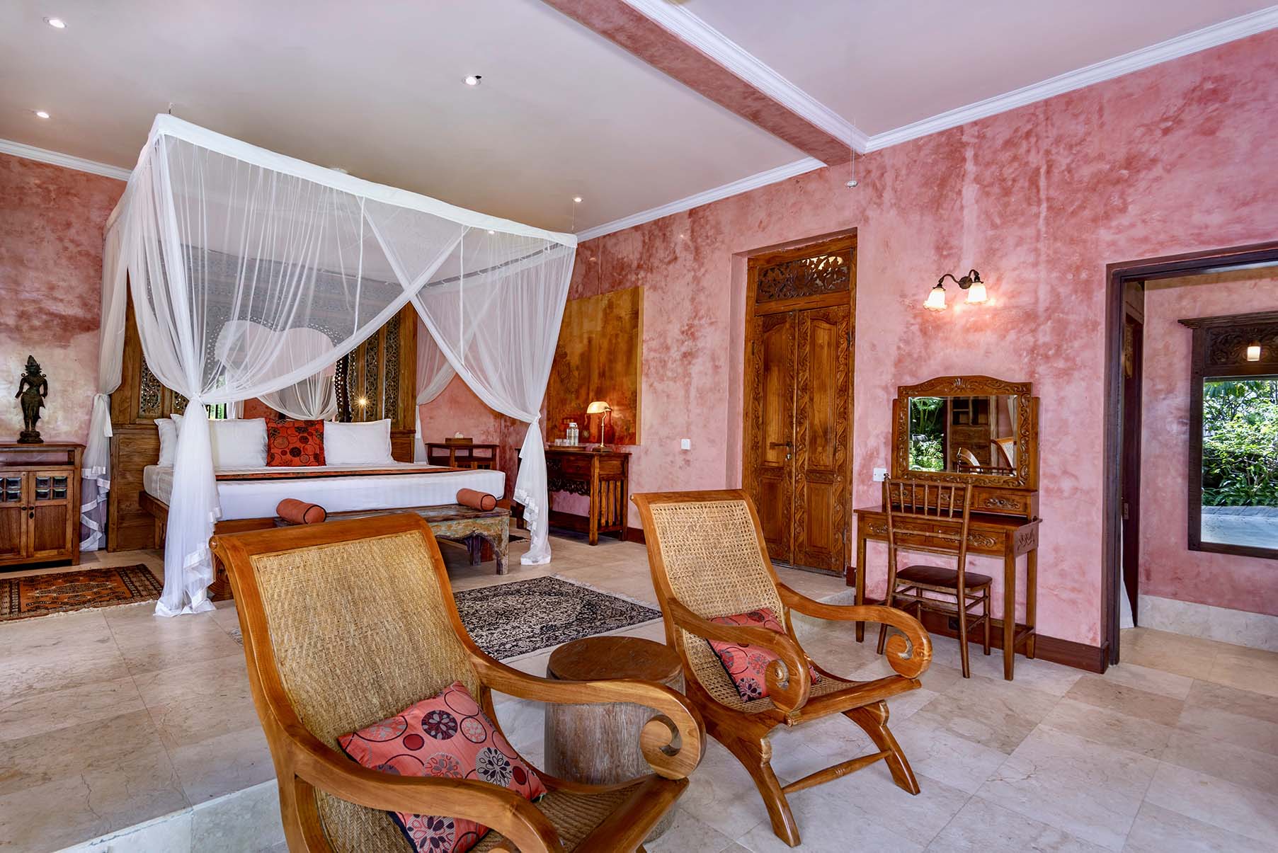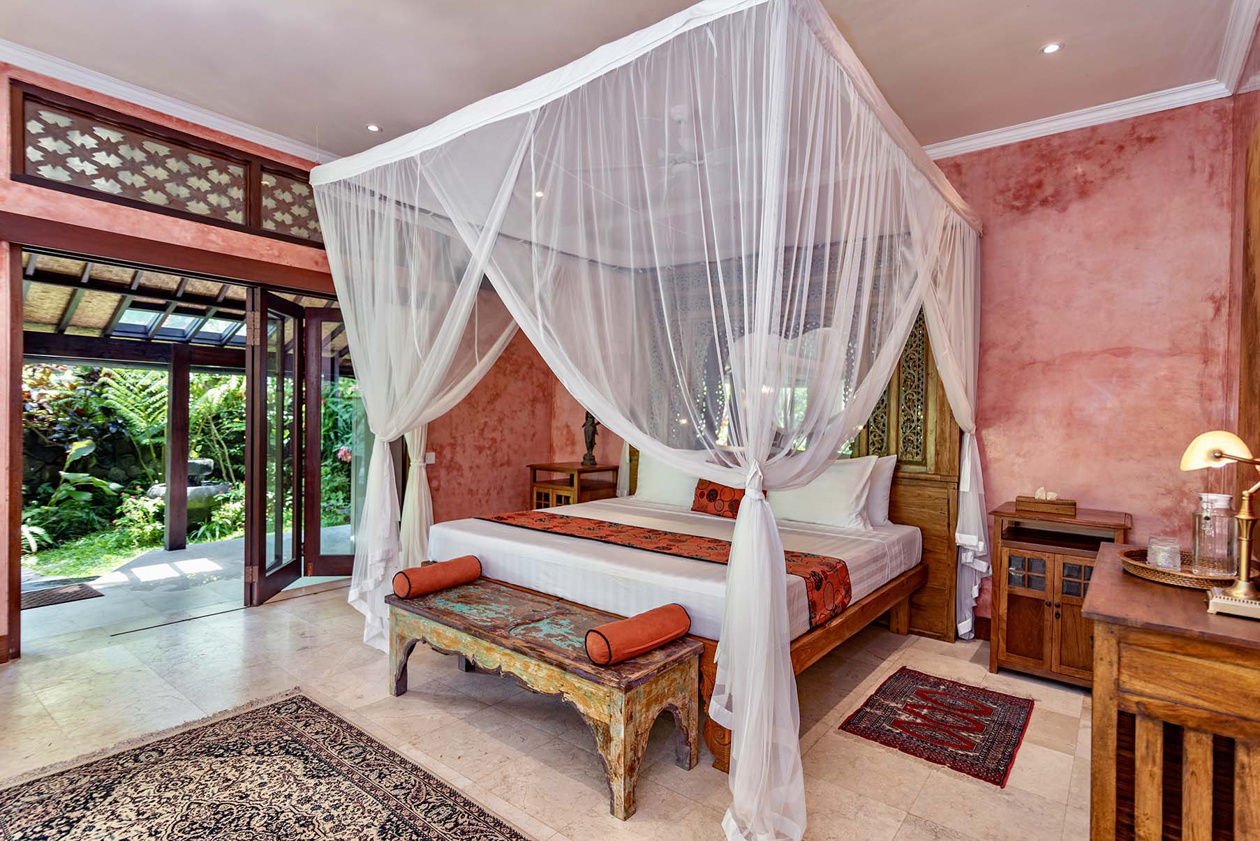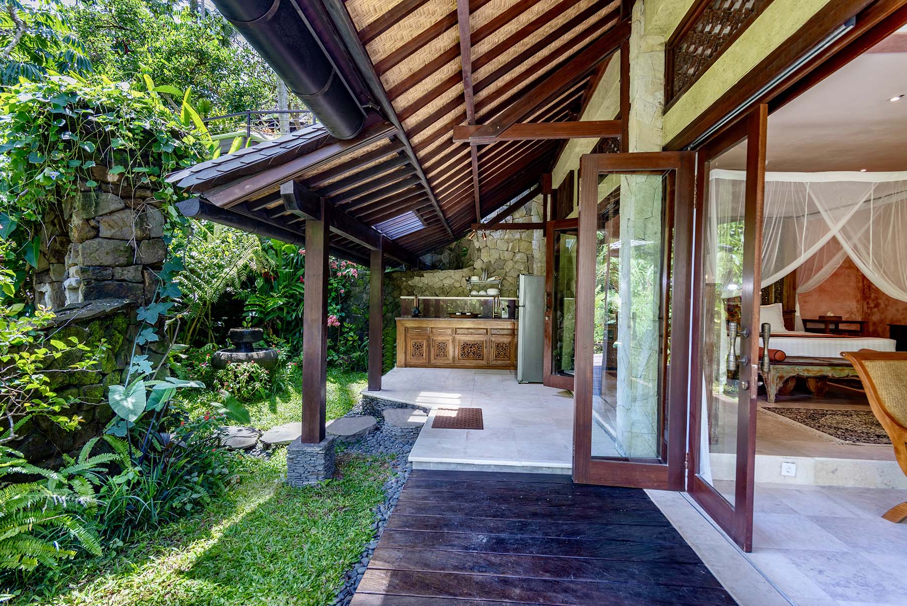 Datura sits within Lumina’s main house, overlooking the lush river valley. Soft pink walls and warm wood details create a calm, spacious retreat that opens easily to the surrounding greenery. Large glass doors lead to a generous private terrace with lounge chairs and wide views across the yoga deck and river below. The space invites slow mornings, afternoon reading, and quiet evenings above the valley. An open air bathroom sits beneath a woven bamboo roof, with a deep stone tub, copper basin, and views of the surrounding treetops. Datura shares the main house with Poppy and can connect with the neighbouring room, making it an ideal space for friends or family traveling together.