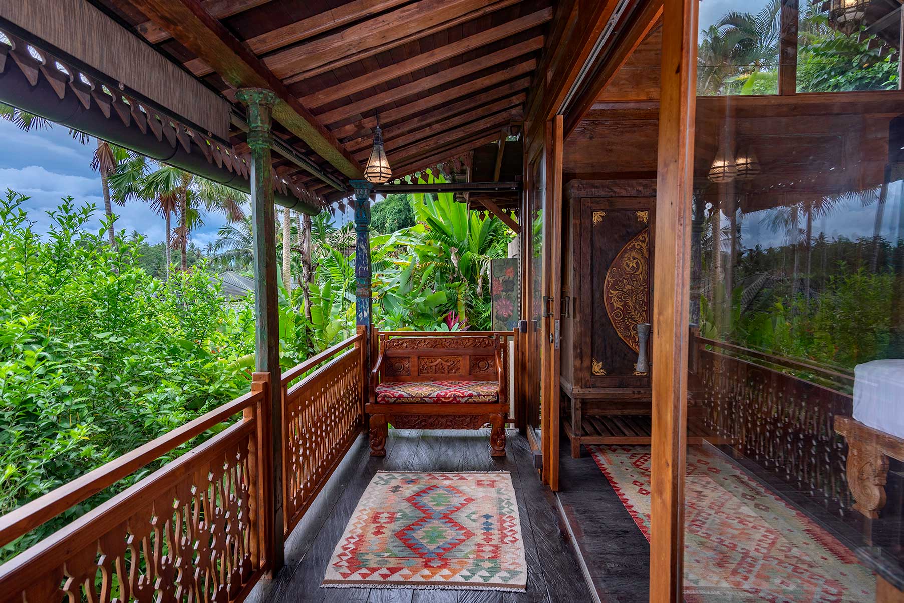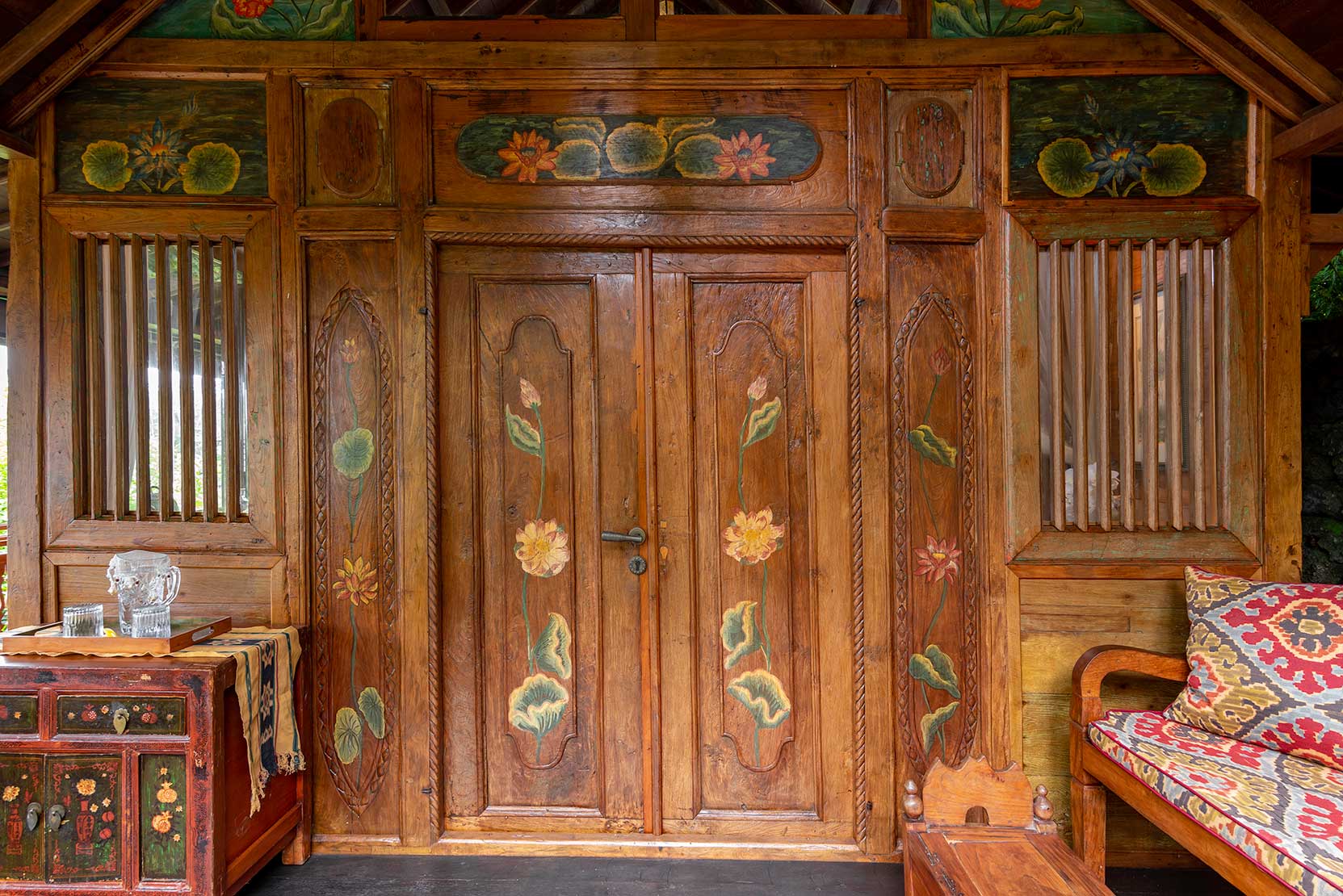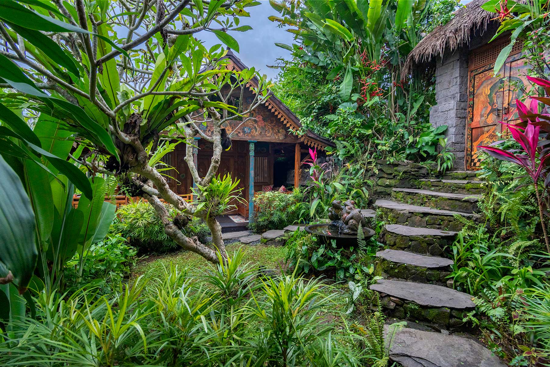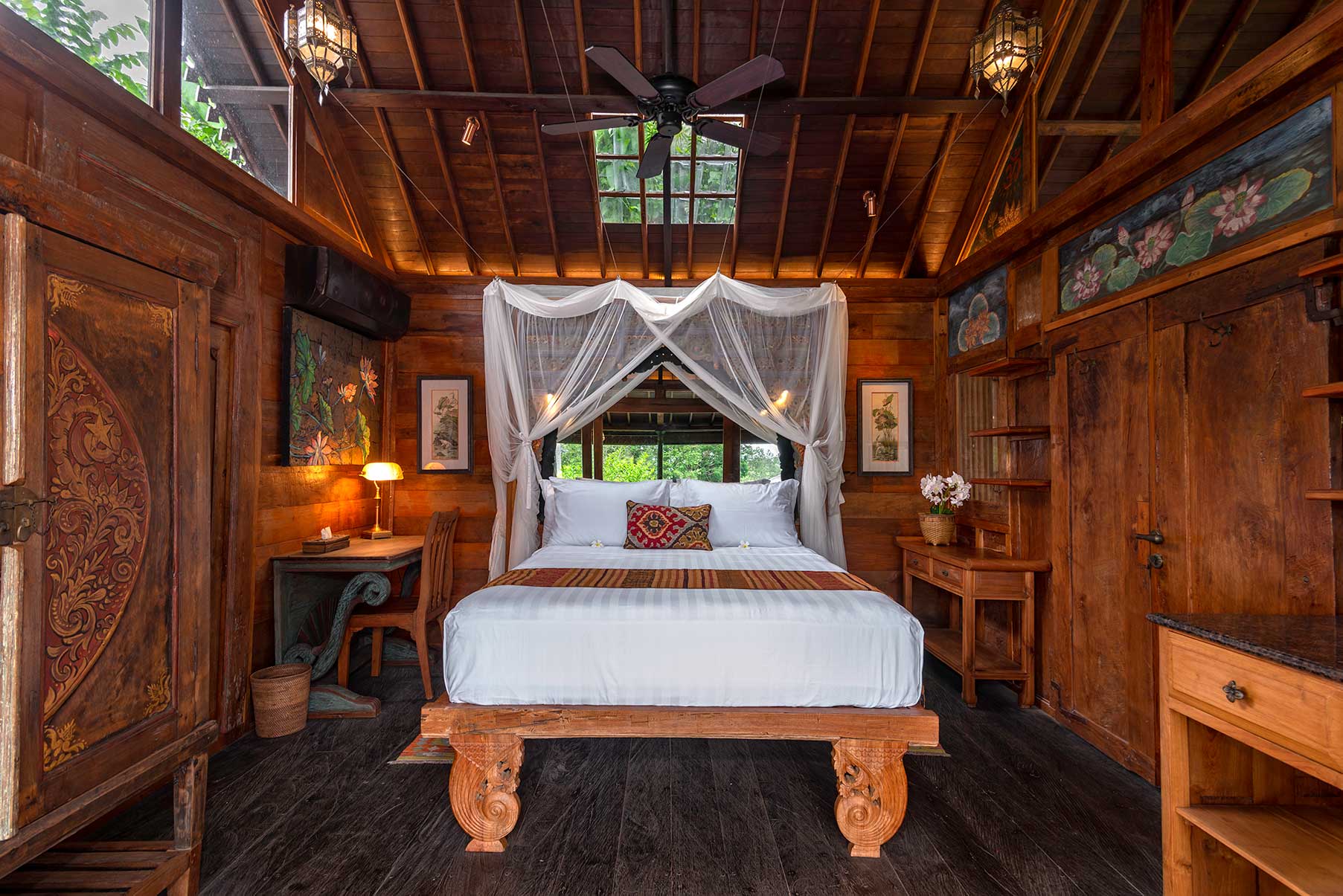 Surrounded by lush gardens and stone pathways, Blue Lotus is a serene sanctuary inspired by purity, stillness, and quiet awakening. Hand-painted floral motifs bloom across carved timber, while vaulted ceilings and open doors invite in soft light and jungle air. The bedroom gazes outward to layered green horizons, and the veranda rests beside a tranquil pond, where water murmurs gently through the garden. Rooted in craftsmanship yet light in spirit, Blue Lotus feels calm, elevated, and meditative — a space for clarity, renewal, and graceful unfolding.