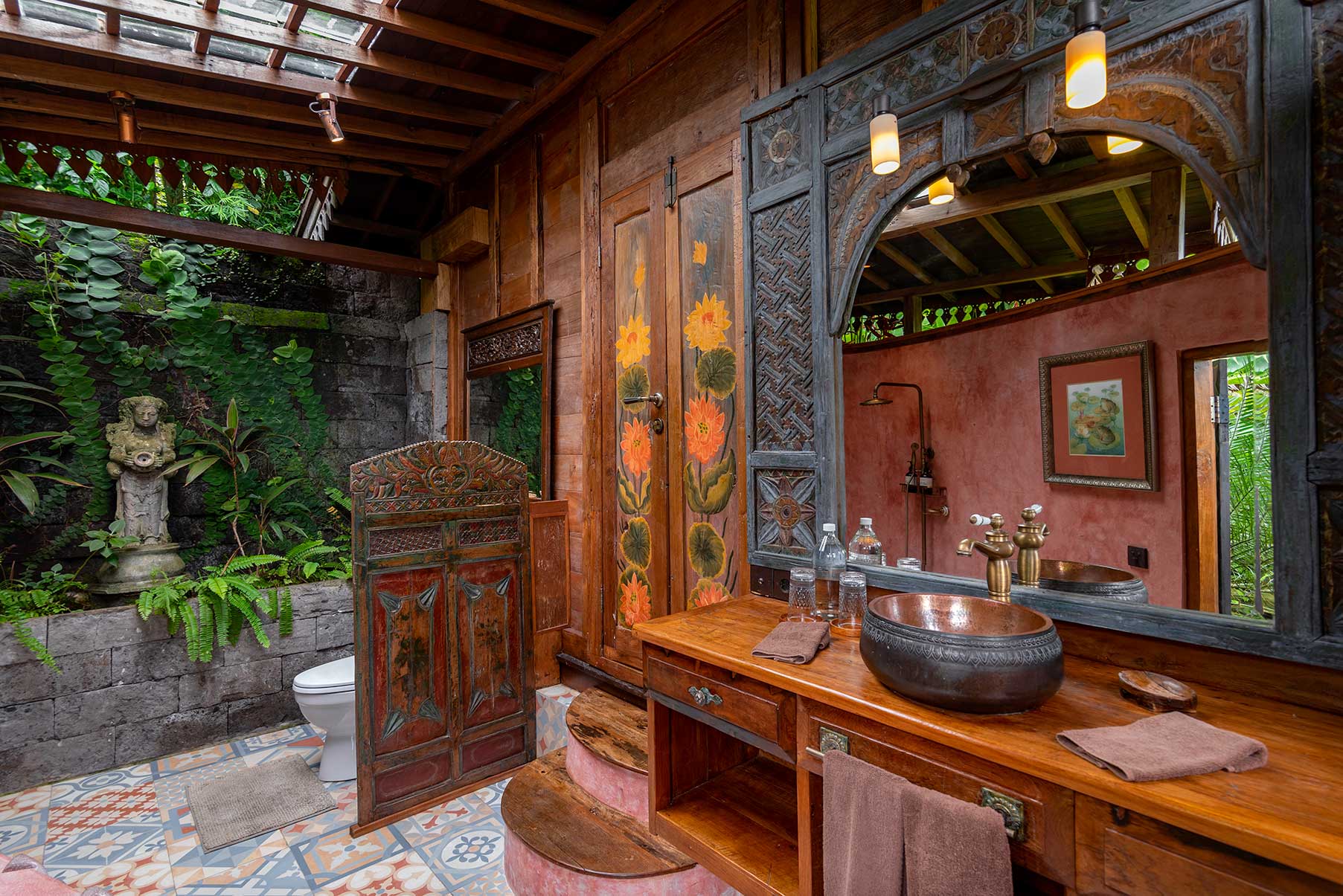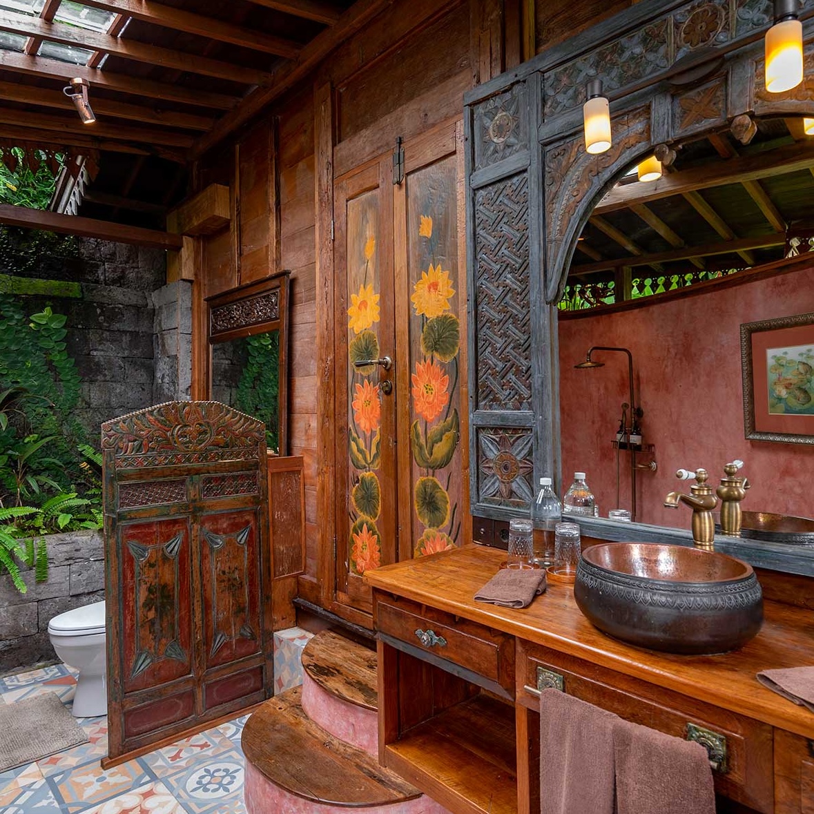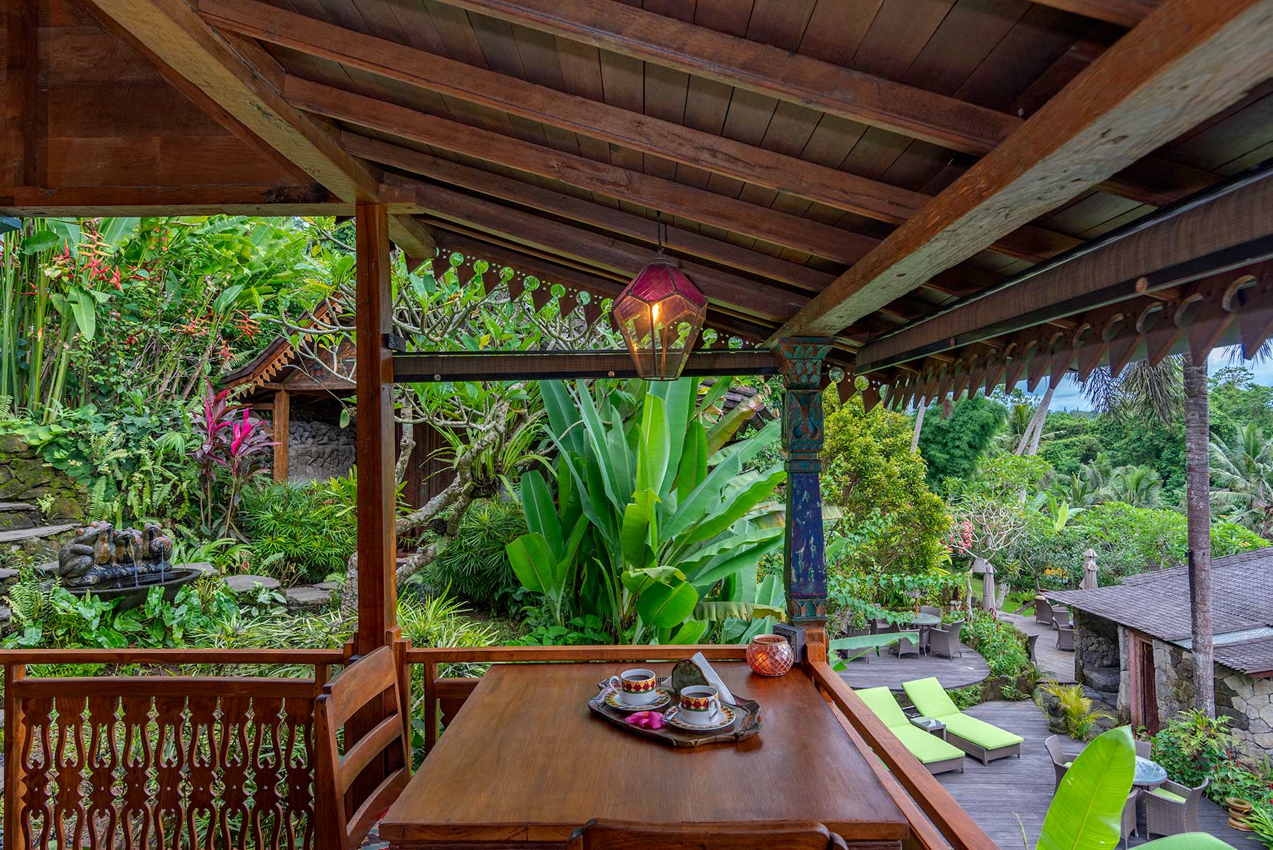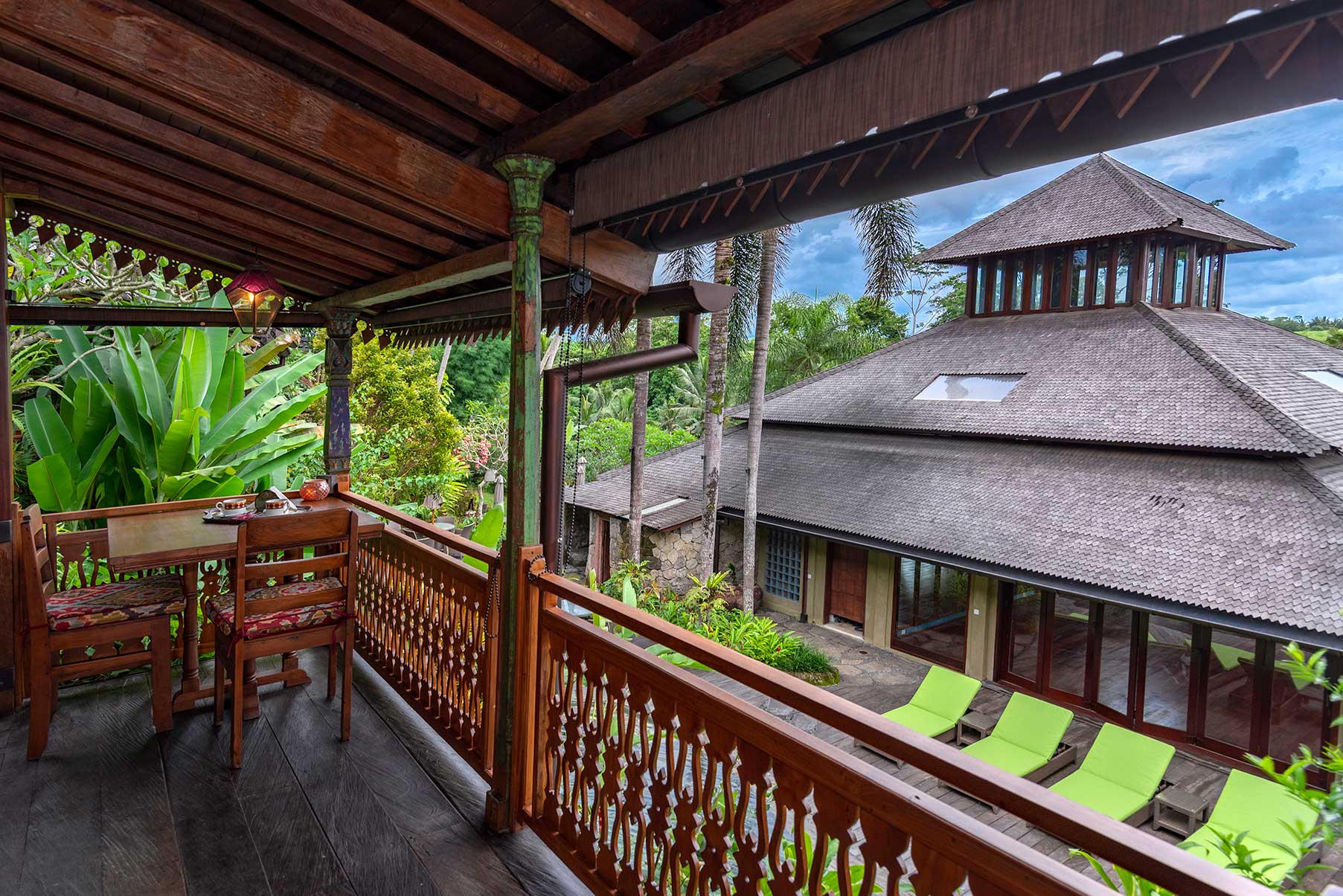 Surrounded by lush gardens and stone pathways, Blue Lotus is a serene sanctuary inspired by purity, stillness, and quiet awakening. Hand-painted floral motifs bloom across carved timber, while vaulted ceilings and open doors invite in soft light and jungle air. The bedroom gazes outward to layered green horizons, and the veranda rests beside a tranquil pond, where water murmurs gently through the garden. Rooted in craftsmanship yet light in spirit, Blue Lotus feels calm, elevated, and meditative — a space for clarity, renewal, and graceful unfolding.
