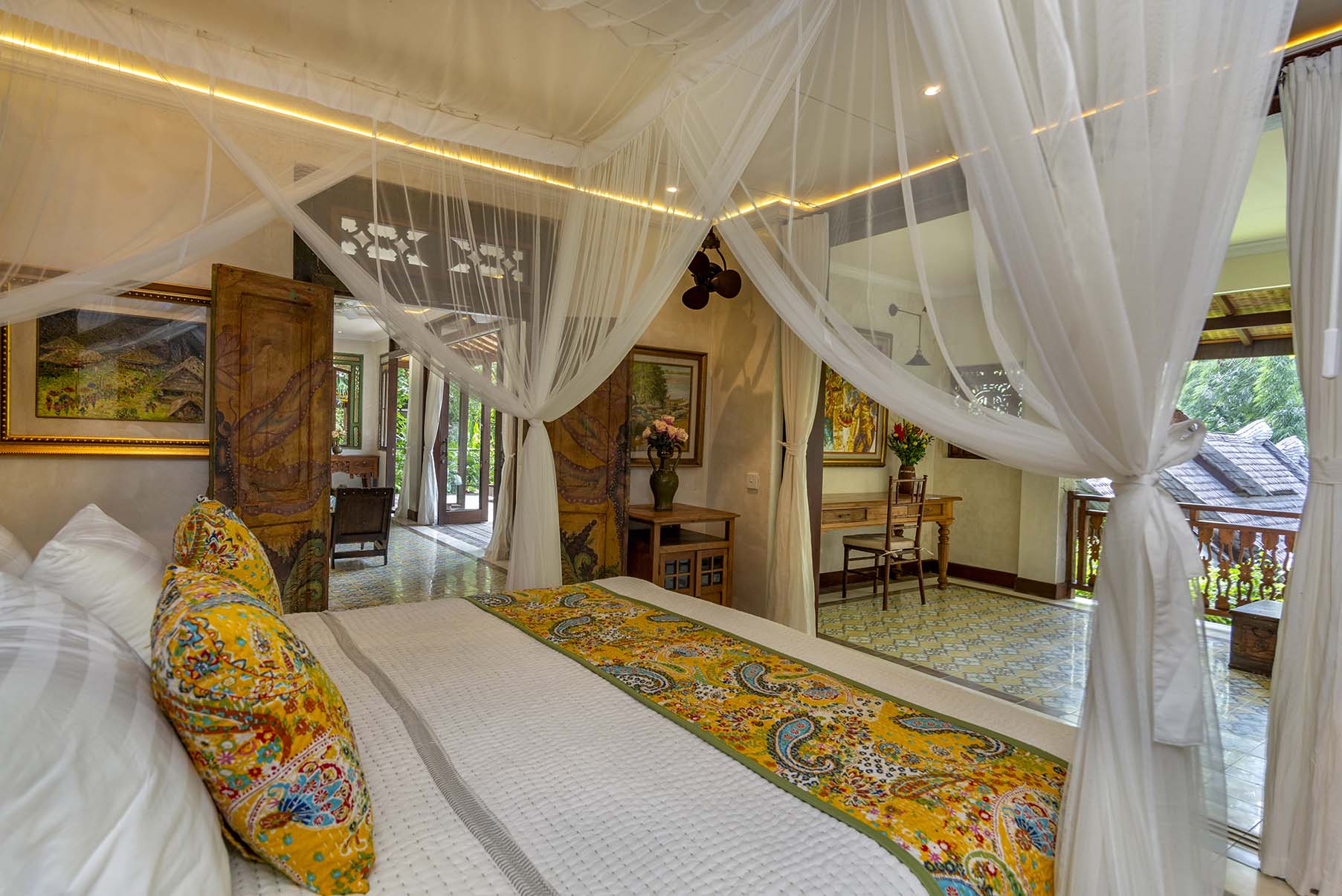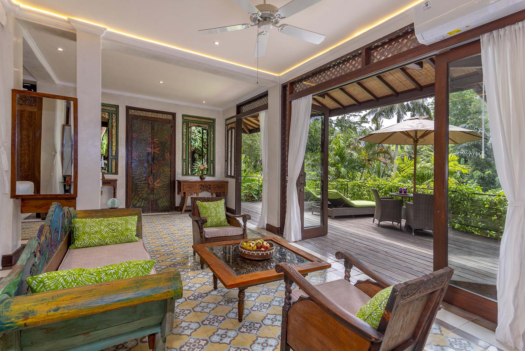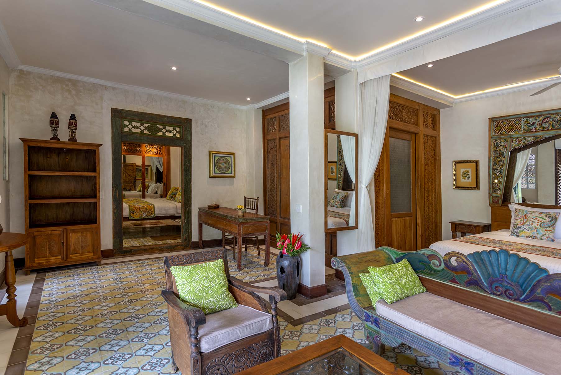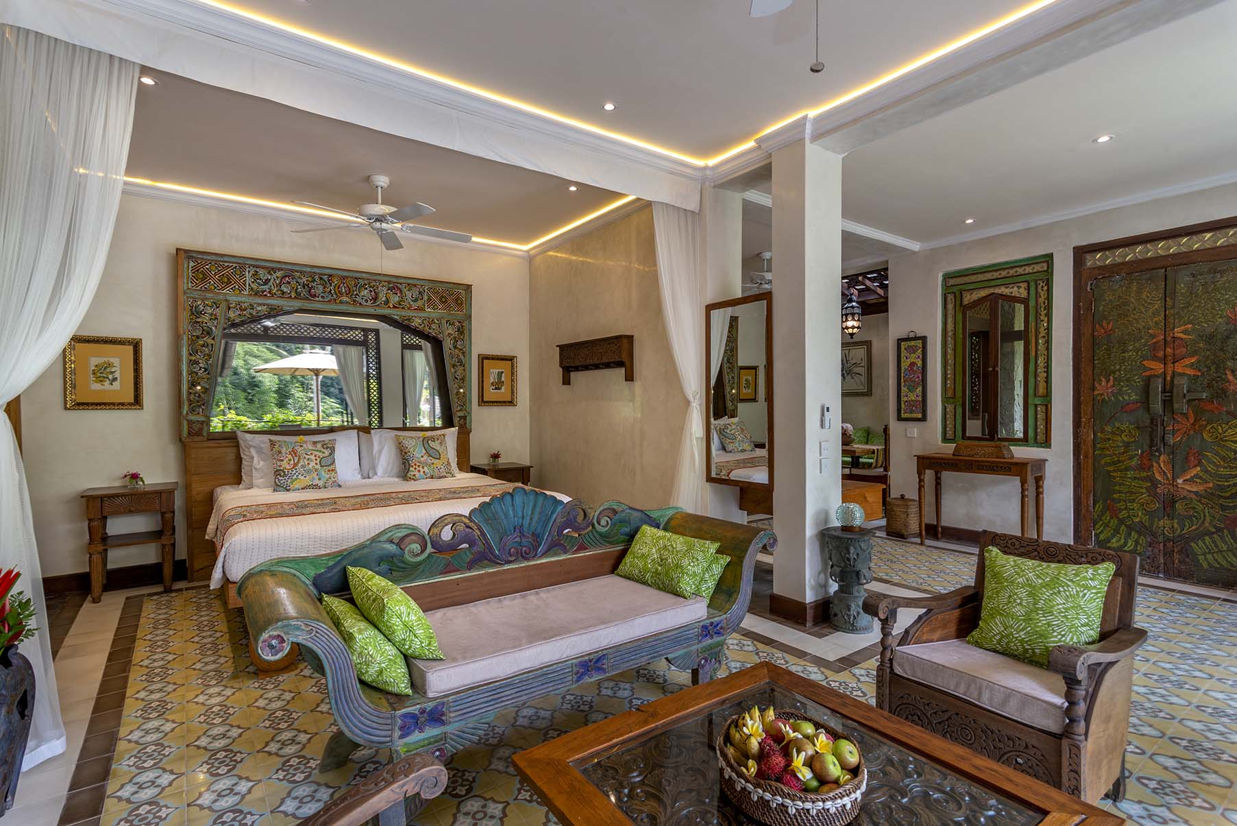 Dragonfly is a two bedroom apartment set above Lumina’s gardens, offering space to settle in while overlooking the surrounding greenery. Large doors open onto a generous terrace where lounge chairs and a shaded table invite quiet mornings and slow afternoons above the valley. Inside, the apartment unfolds as a spacious living area with a carved wooden bed, sitting space, and a private kitchen beside the dining nook. Patterned tiles, hand painted doors, and warm wood details bring colour and character throughout the space. Two bedrooms offer privacy and comfort, each connected by the central living area. Dragonfly is well suited for friends, couples traveling together, or families seeking a little more room while sharing the atmosphere of Lumina.
