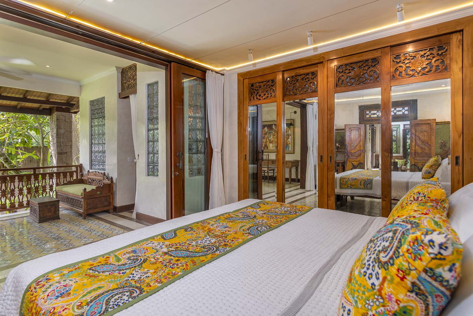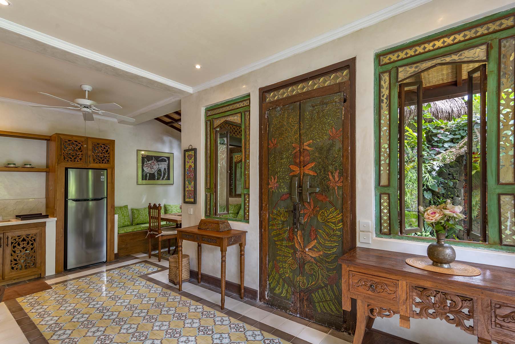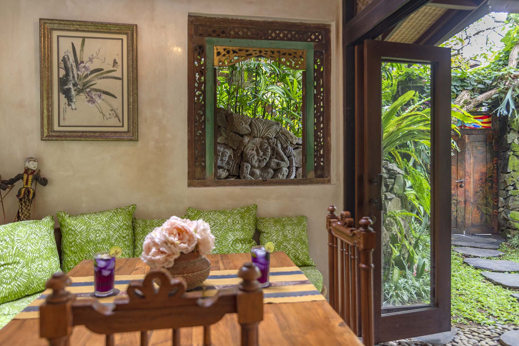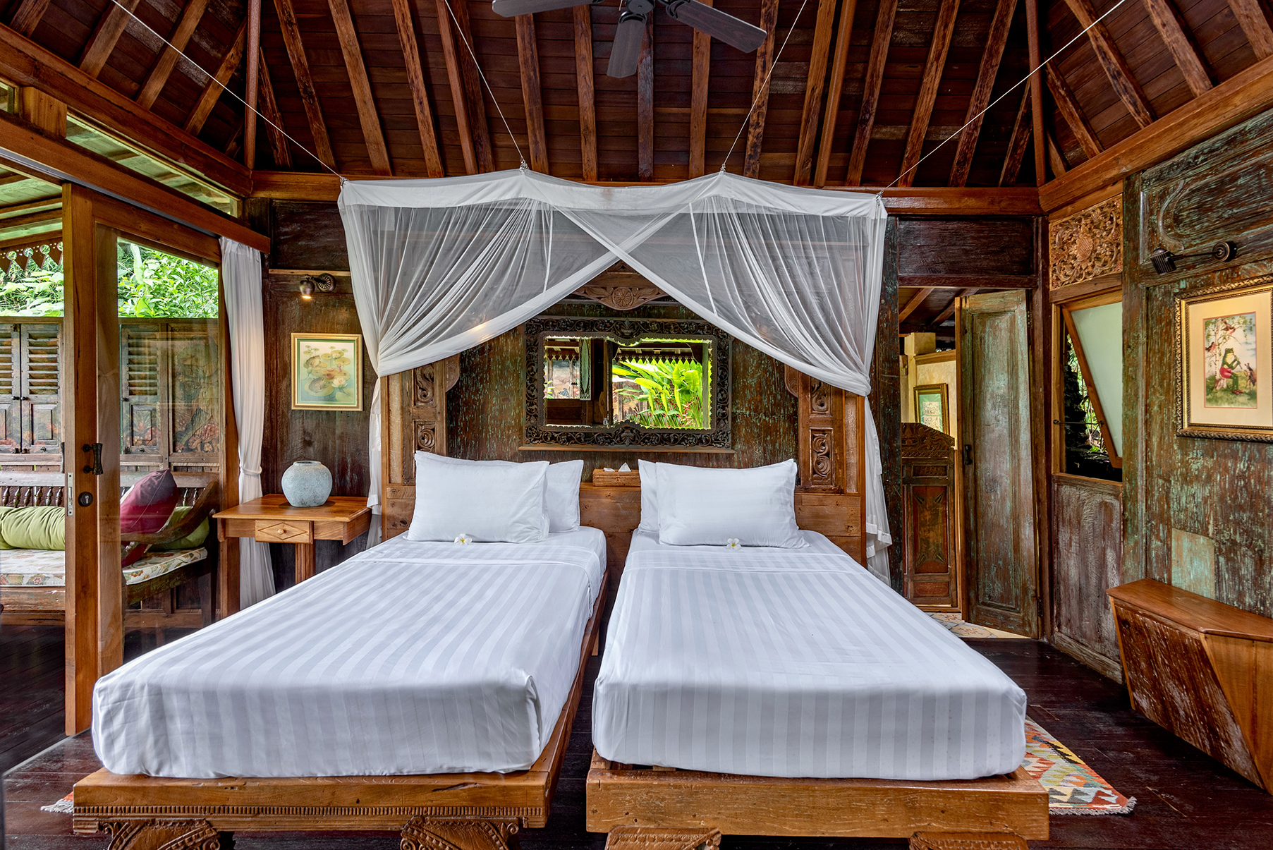 Dragonfly is a two bedroom apartment set above Lumina’s gardens, offering space to settle in while overlooking the surrounding greenery. Large doors open onto a generous terrace where lounge chairs and a shaded table invite quiet mornings and slow afternoons above the valley. Inside, the apartment unfolds as a spacious living area with a carved wooden bed, sitting space, and a private kitchen beside the dining nook. Patterned tiles, hand painted doors, and warm wood details bring colour and character throughout the space. Two bedrooms offer privacy and comfort, each connected by the central living area. Dragonfly is well suited for friends, couples traveling together, or families seeking a little more room while sharing the atmosphere of Lumina.