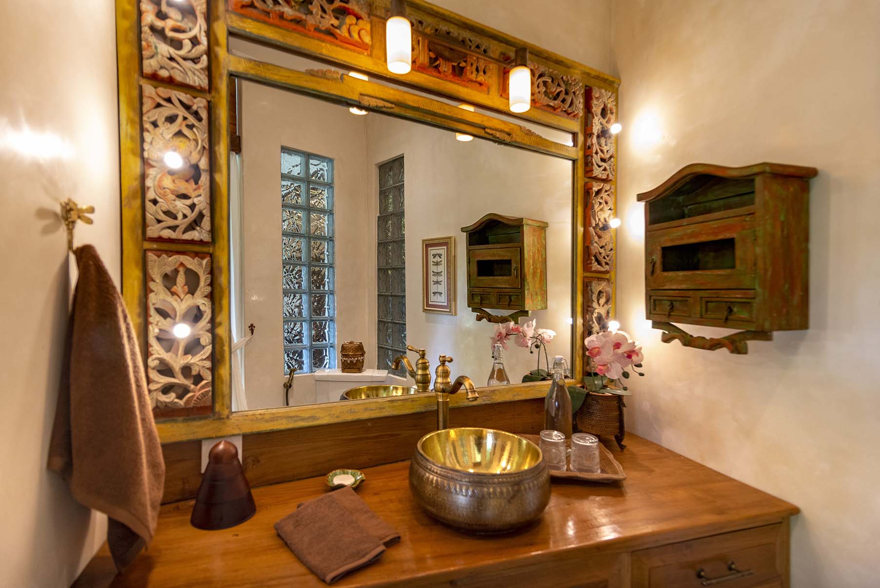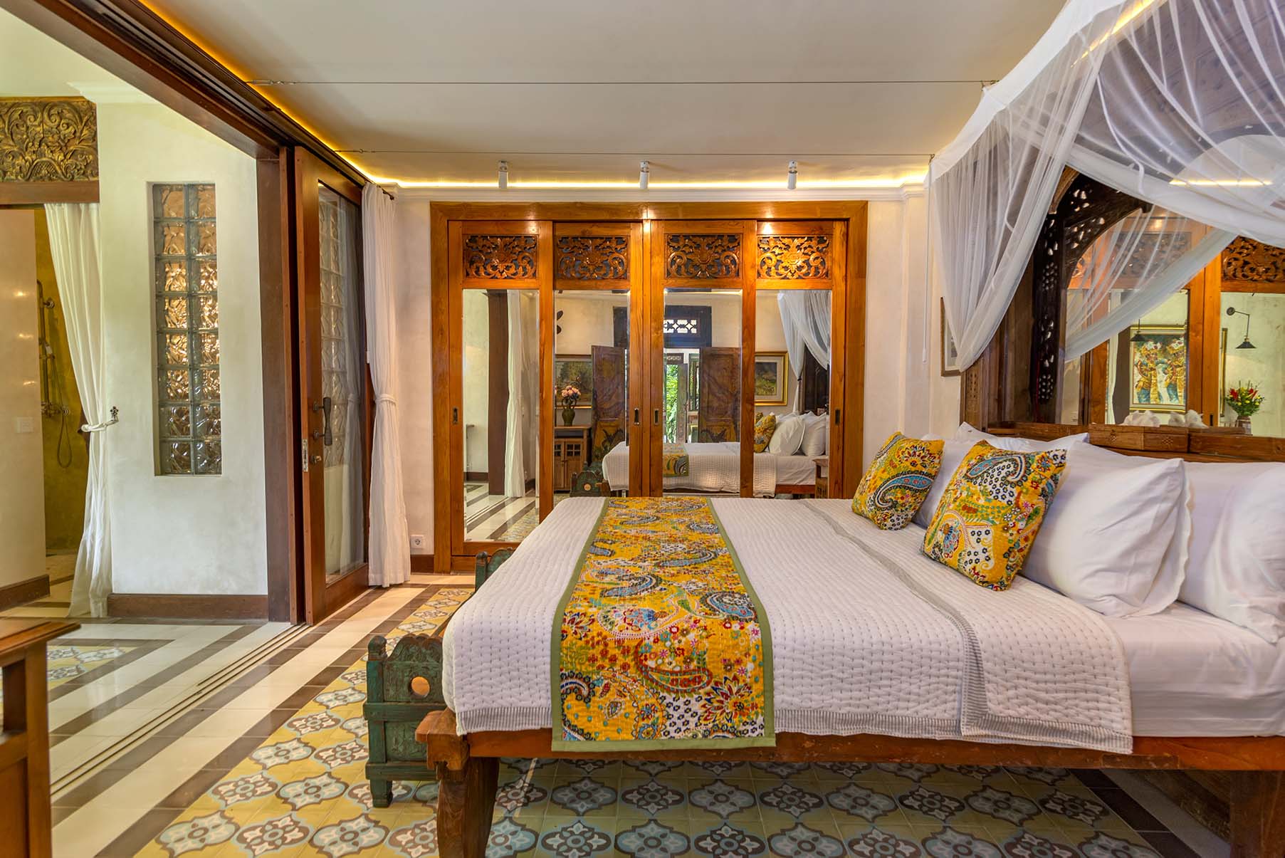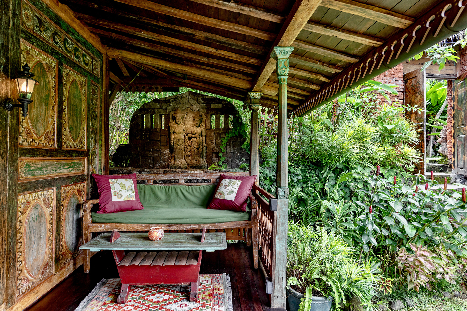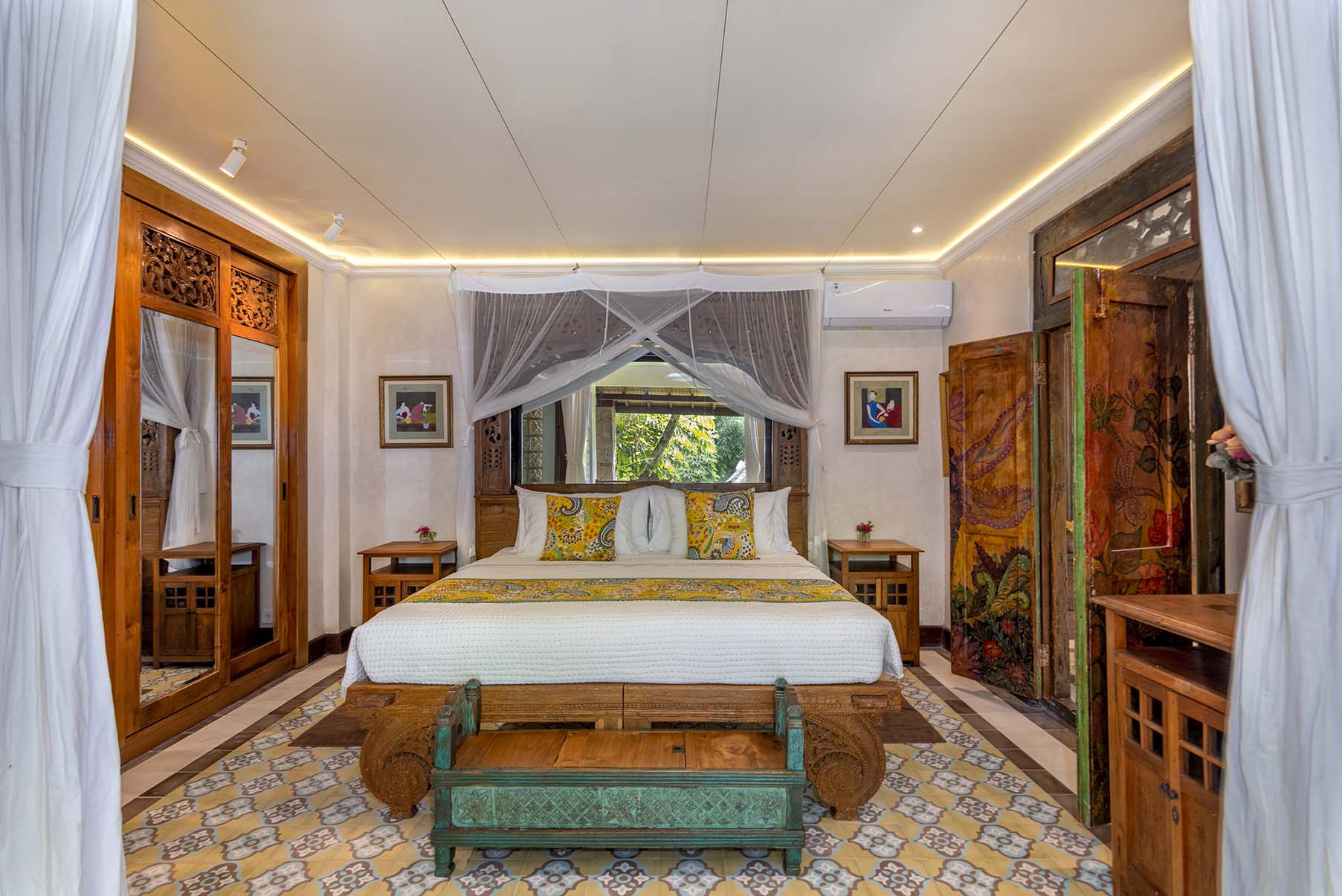 Dragonfly is a two bedroom apartment set above Lumina’s gardens, offering space to settle in while overlooking the surrounding greenery. Large doors open onto a generous terrace where lounge chairs and a shaded table invite quiet mornings and slow afternoons above the valley. Inside, the apartment unfolds as a spacious living area with a carved wooden bed, sitting space, and a private kitchen beside the dining nook. Patterned tiles, hand painted doors, and warm wood details bring colour and character throughout the space. Two bedrooms offer privacy and comfort, each connected by the central living area. Dragonfly is well suited for friends, couples traveling together, or families seeking a little more room while sharing the atmosphere of Lumina.