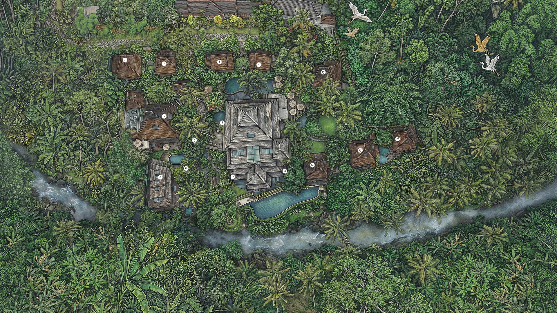 The map reveals the relationship between villas, pools, gathering spaces, and jungle surrounds — offering perspective before arrival and clarity in choosing your ideal location.